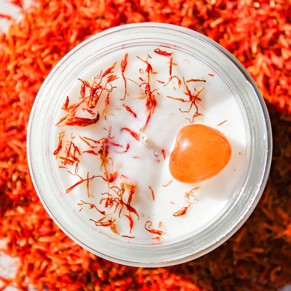 A stimulating blend of premium all natural-soy wax with fragrance of Safflower; topped with Carnelian crystal, our SACRAL CHAKRA Candle unblocks the Second Chakra that helps to balances emotions, aid self nurturing; and enhance feelings of pleasure that leads one to grow and evolve as an individual while enjoying every moment of life. Ideal for meditation, for aiding relaxation and for elevating a space with a sense of balance. Perfect gift for any occasion. Hand-made in Canada, with great passion and care, with a total burn time of 30+ hours.