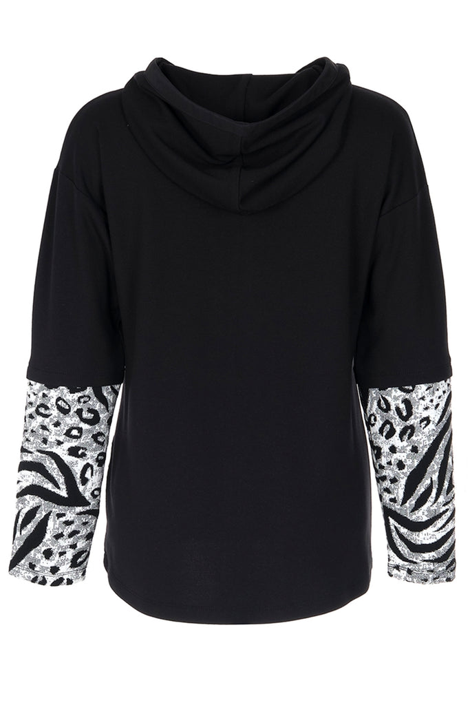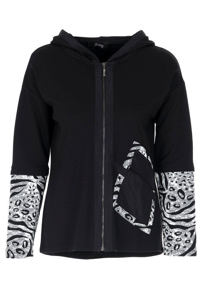 he EverSassy by Dolcezza Zippered Jacket with Pockets is a classic high neck front zippered jacket with a large hoodie and animal print detail on the sleeve.  It features a slanted pocket at the front with matching animal detail. It has a loose fitting silhouette with a hi-lo hemline making it fun to wear as a top alone or as a jacket with your favourite bottom.