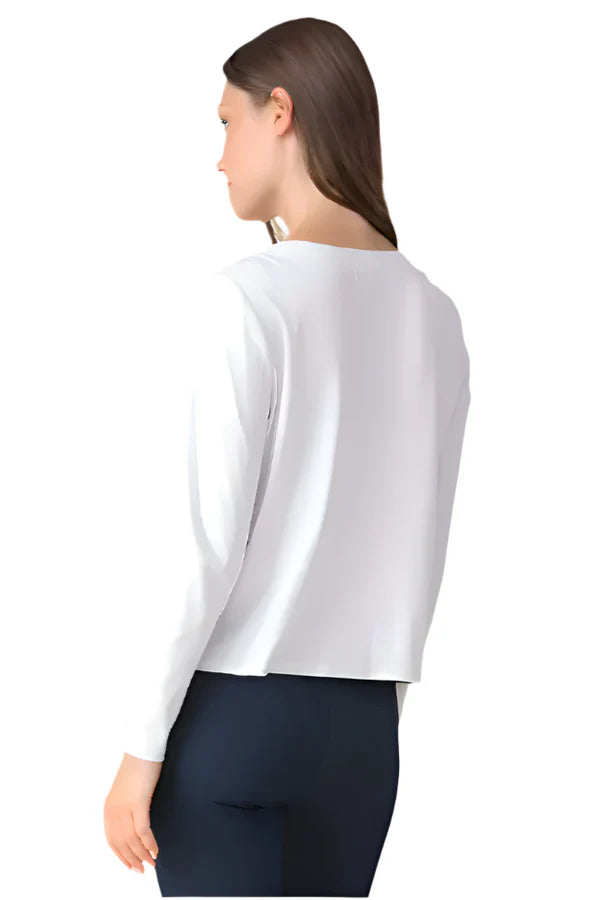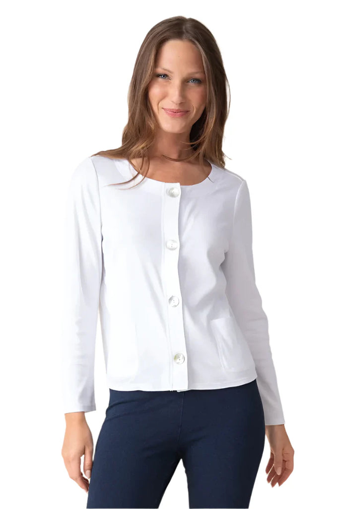 The Habitat Throw On Cardigan is made of 100% soft cotton. It has a crew neckline with agoya shell buttons down the front. It has a boxy fit with long sleeves and two front patch pockets. This jacket falls just below the waist line. Wear it as a jacket or alone all buttoned up.