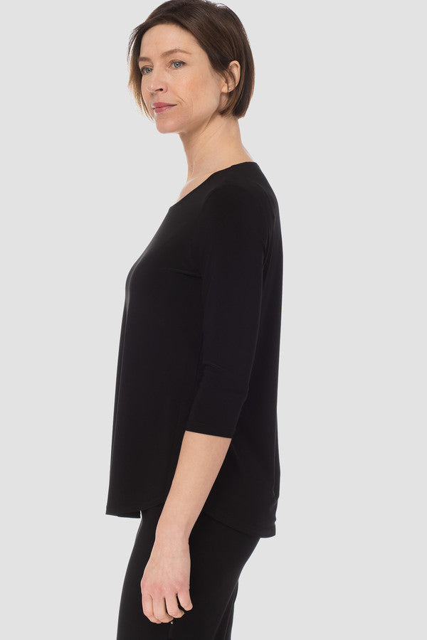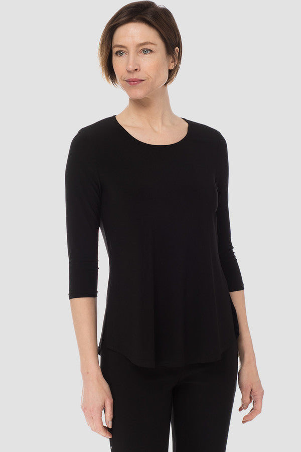 The Joseph Ribkoff three-quarter length sleeves, rounded neckline and rounded hem hits just past the hip. This top has a comfortable, slightly tailored fit, which is great for wearing with casual and formal coordinates.