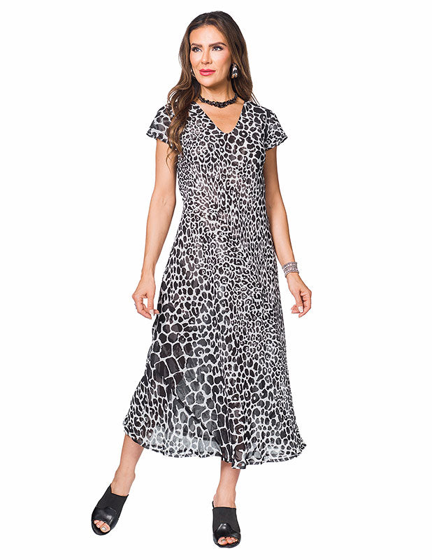 The Minkas dress has cap sleeves and a v neckline. It is cut on the bias so it flows loosely on the body. This dress is reversible with another pattern on the other side. Two dresses in one.