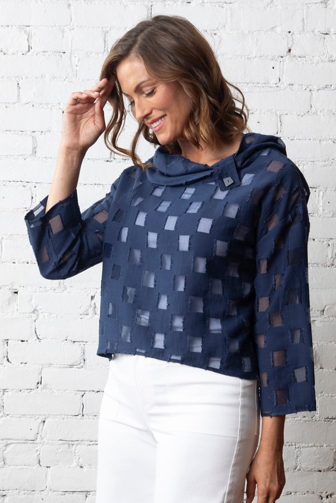 The Olivia Outside the Box Top is the perfect layering piece. This 3/4 length sleeve top is the perfect blend of modern style and laid-back elegance. Scattered throughout with sheer squares that are subtly fringed for a hint of texture. It has a loose boxy short fit with a cowl neckline.