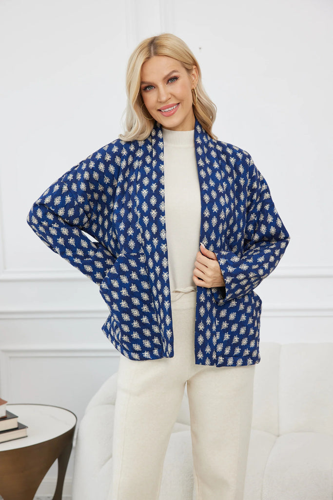 The Orange by Fashion Village Quilted Sateen Jacket will keep you cozy and stylish. Featuring a royal pattern and Italian sateen lining, this thigh-length jacket boasts roomy patch pockets and an open front for easy layering. Perfect for chilly days, its quilted design and long sleeves provide warmth and comfort.