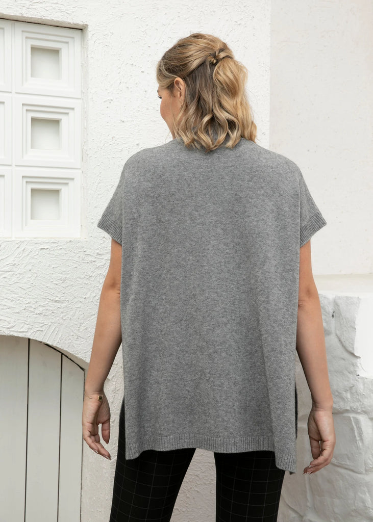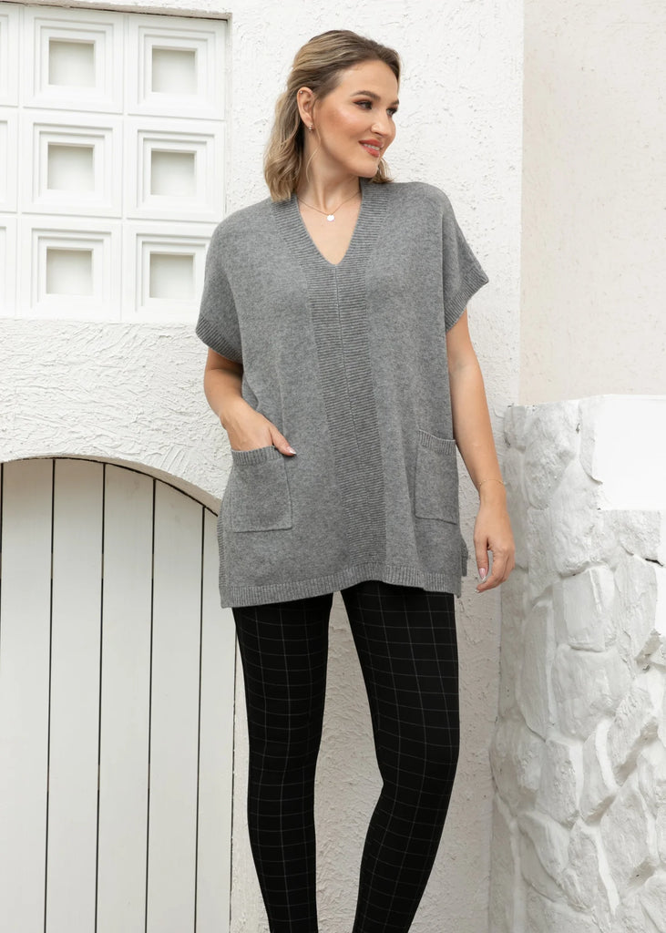 The Orange by Fashion Village Short Sleeve Topper has a deep v-neckline and two large front patch pockets. It features side slits with ribbing down the front and along the hemline and edges. Perfect to wear alone or as a topper piece over any long sleeve shirt or sweater.